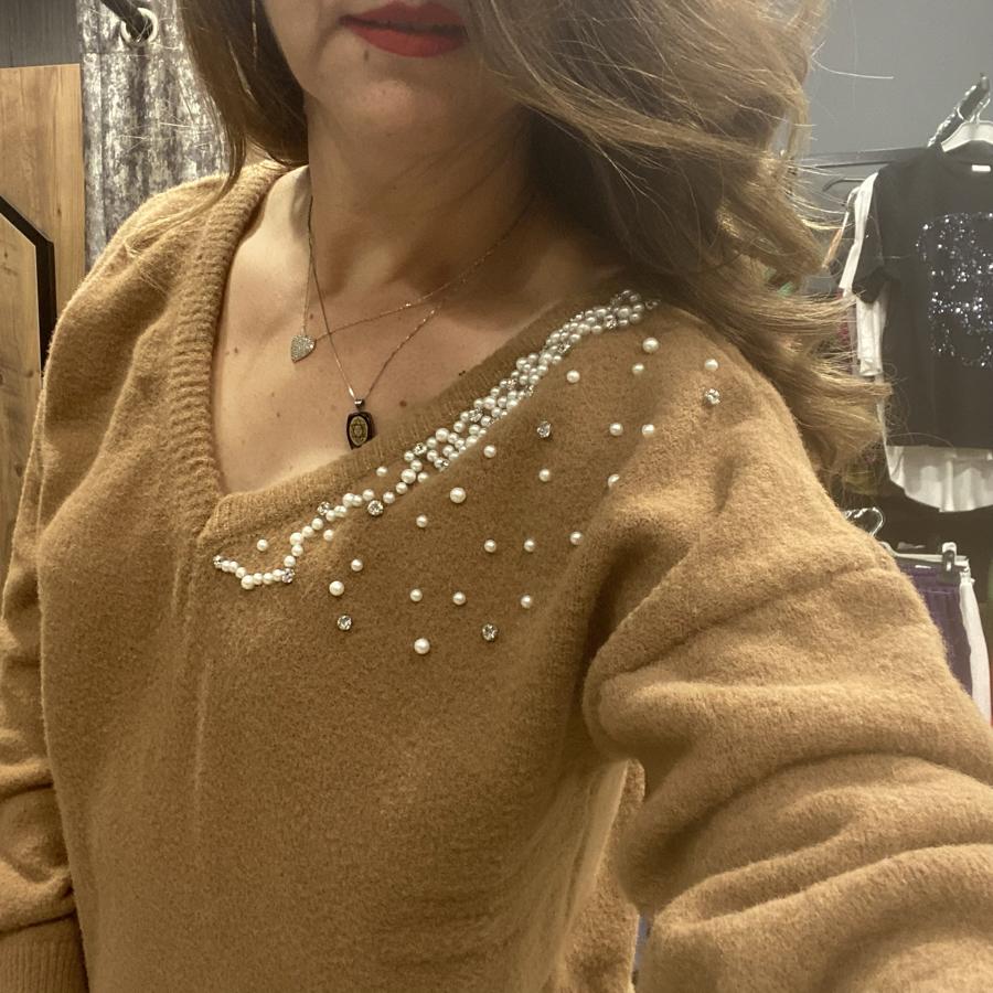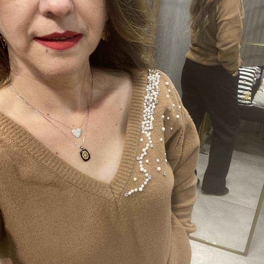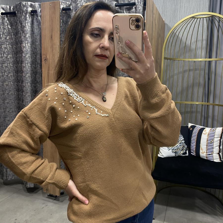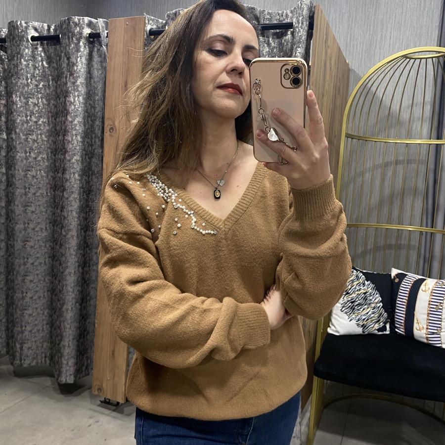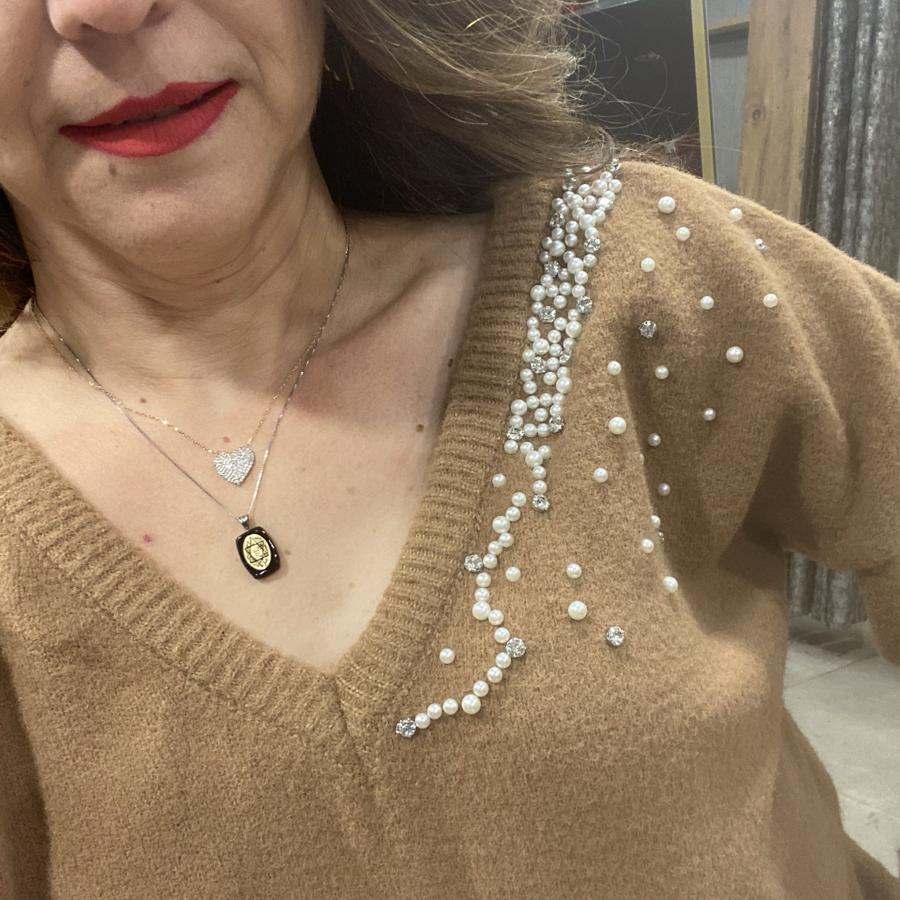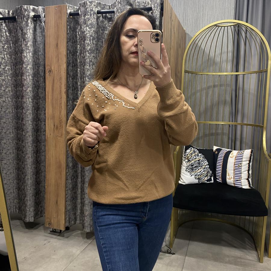 İnci Detaylı Ön Ve Arka V Yaka Yumuş Kazak