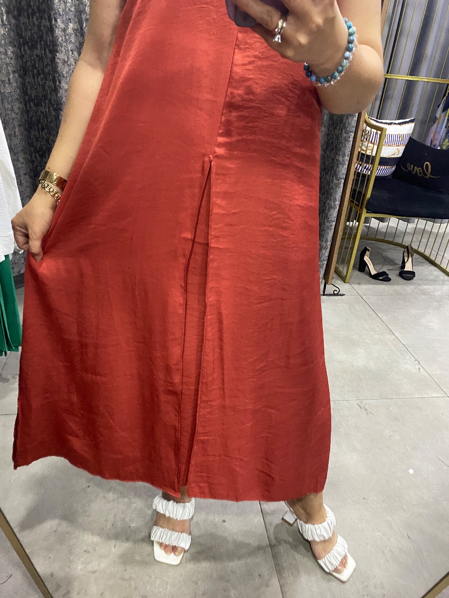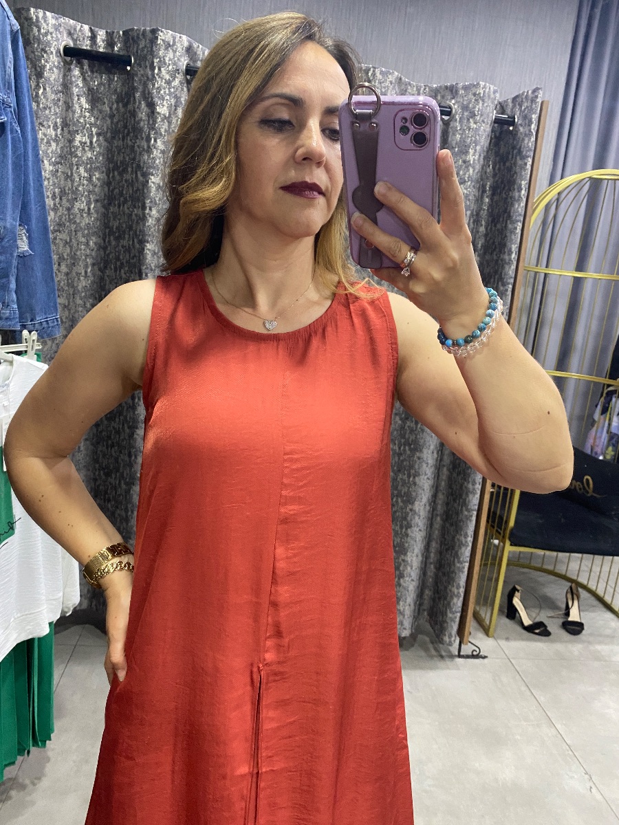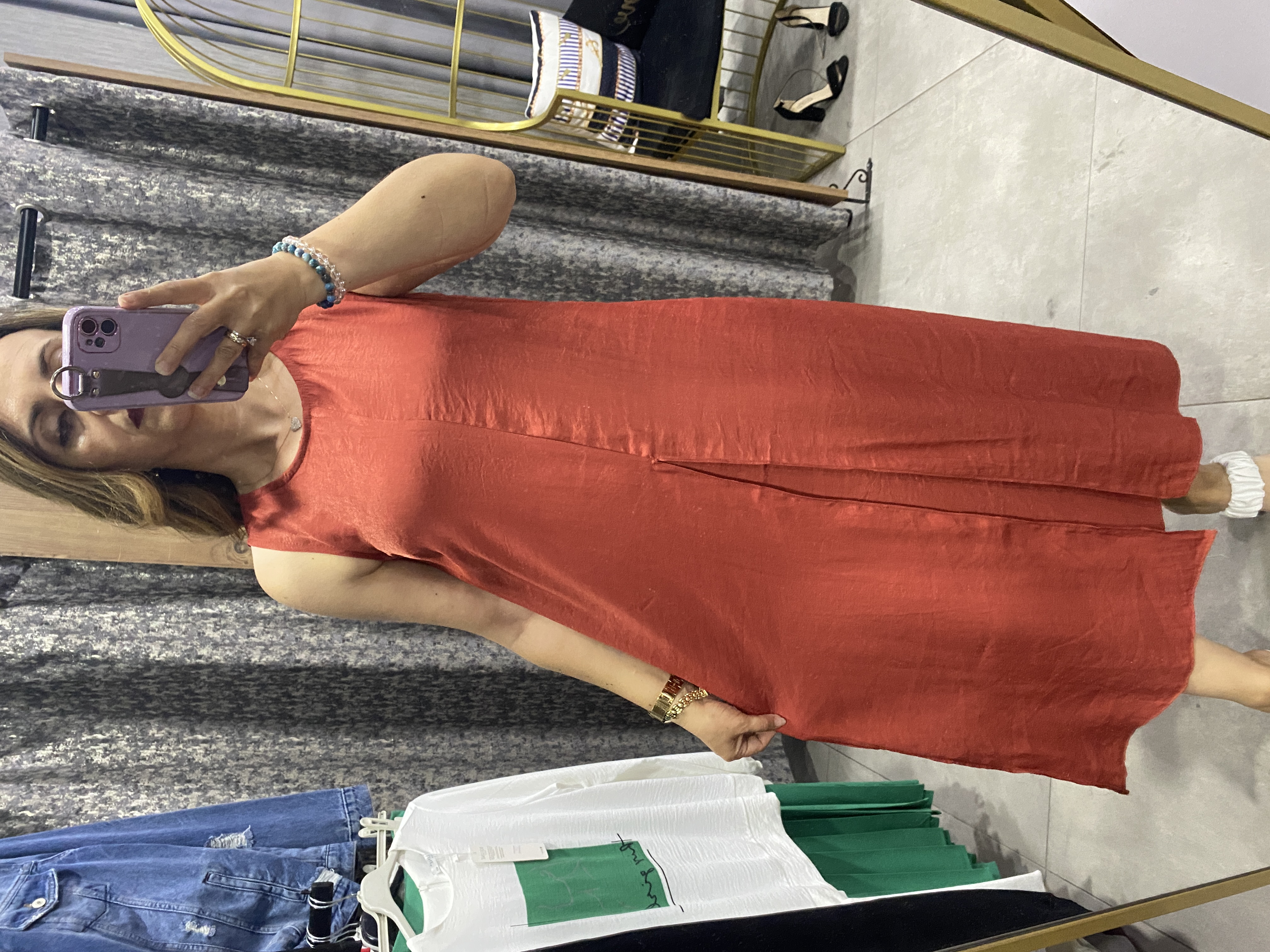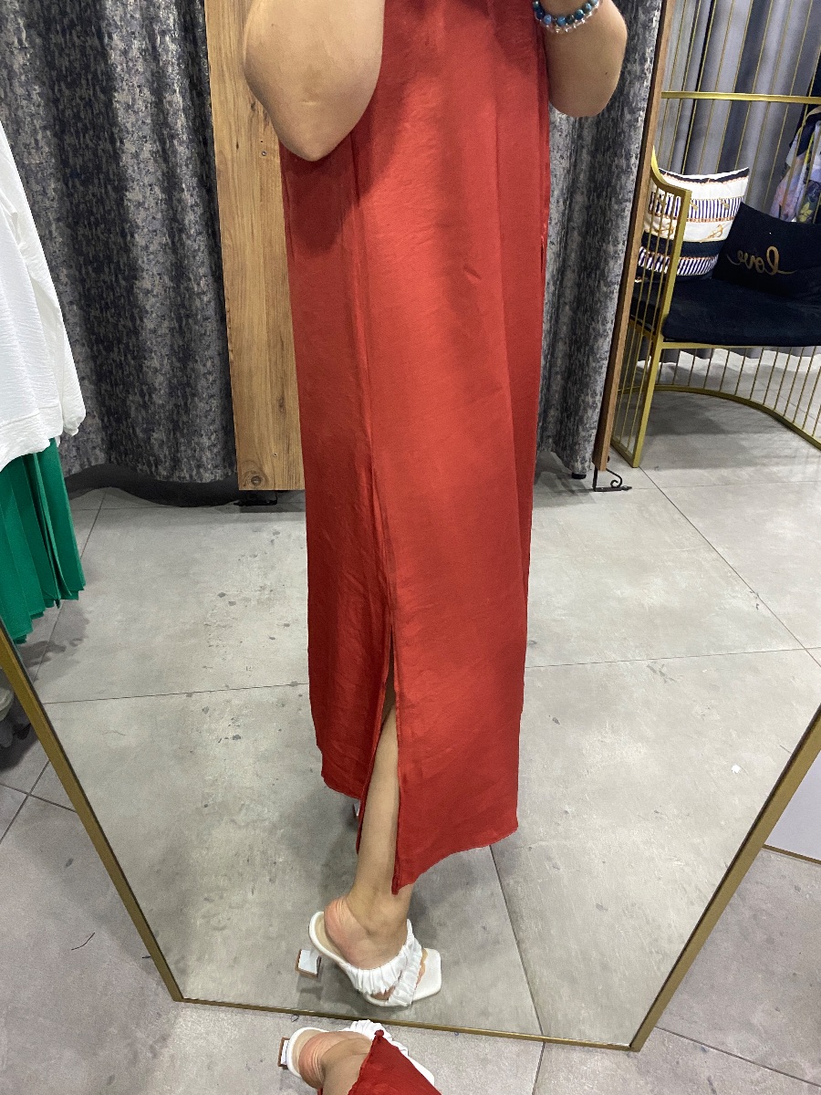 Önden Kapalı Yırtmaçlı Yandan Açık Yırtmaçlı Kolsuz Kadın Elbise