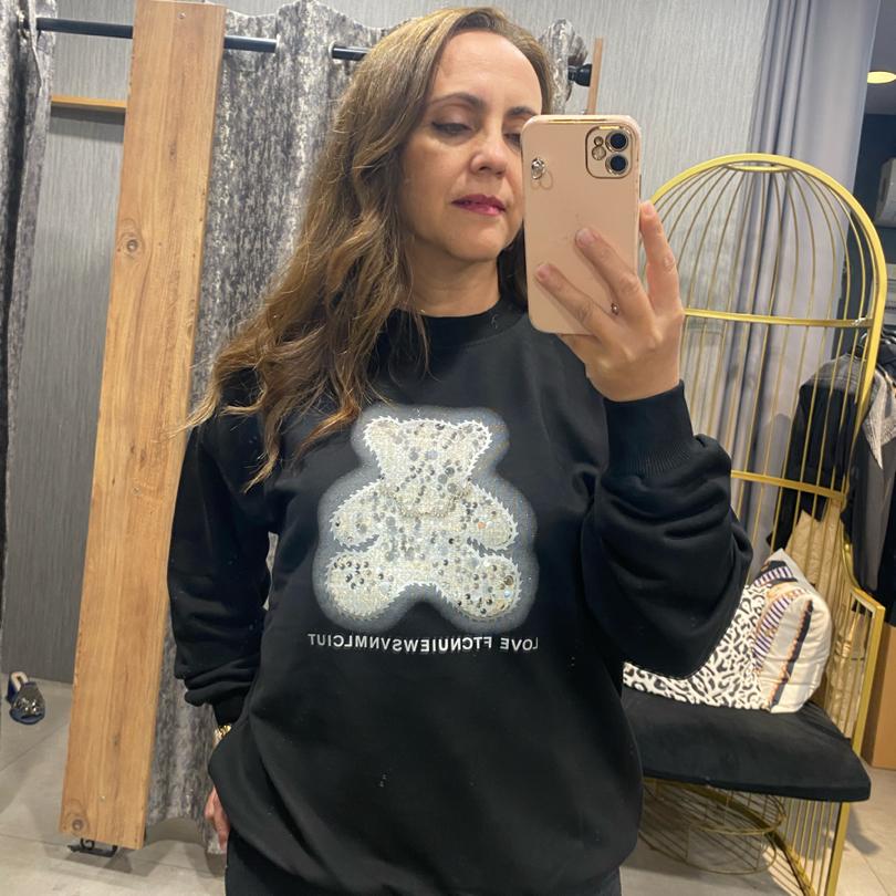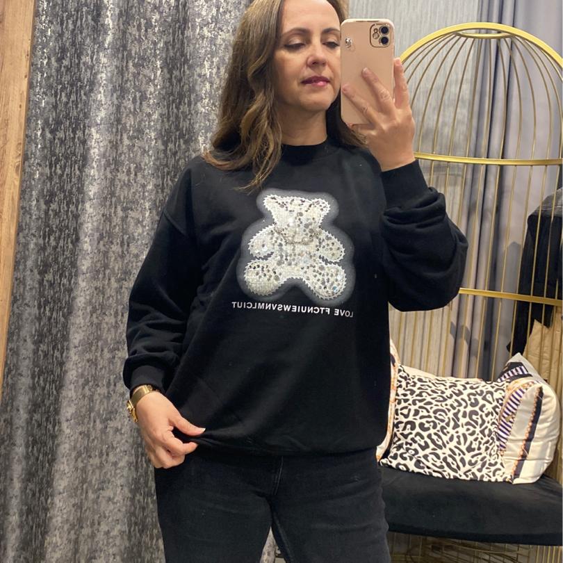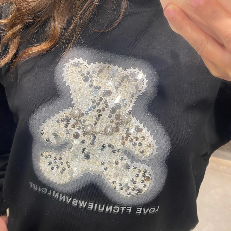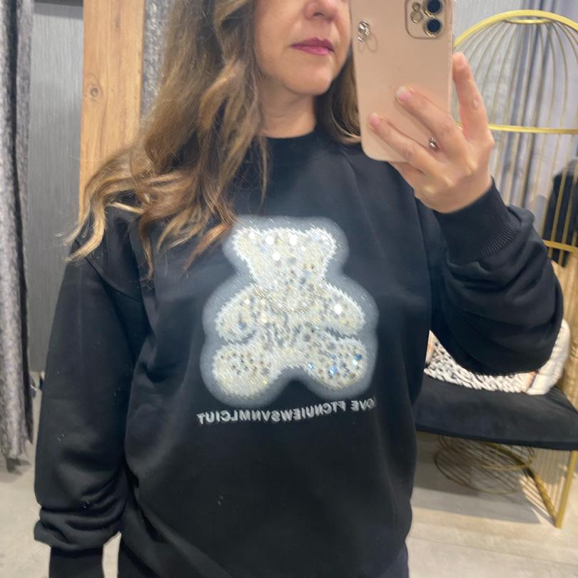 Taş İşlemeli Ayıcıklı Şardonsuz Siyah Sweat